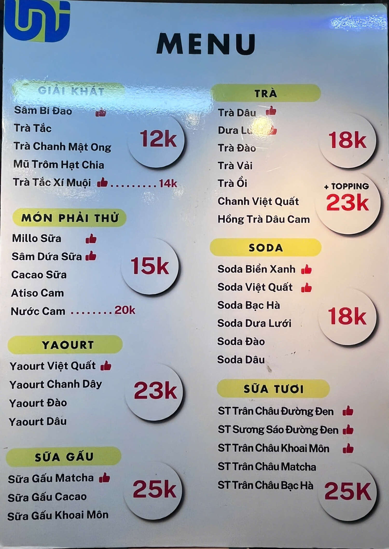 Tại đây, bạn sẽ được thưởng thức đủ vị hấp dẫn: sâm bí đao, trà tắc – chanh mật ong, mủ trôm hạt chia đến yaourt mix vị, sữa tươi trân châu, sữa gấu mix vị, soda mix vị. Ngoài ra, các món trà topping, cacao – Milo – sâm dứa sữa – atiso cam cũng được pha chế tinh tế, mang hương vị độc đáo riêng biệt.