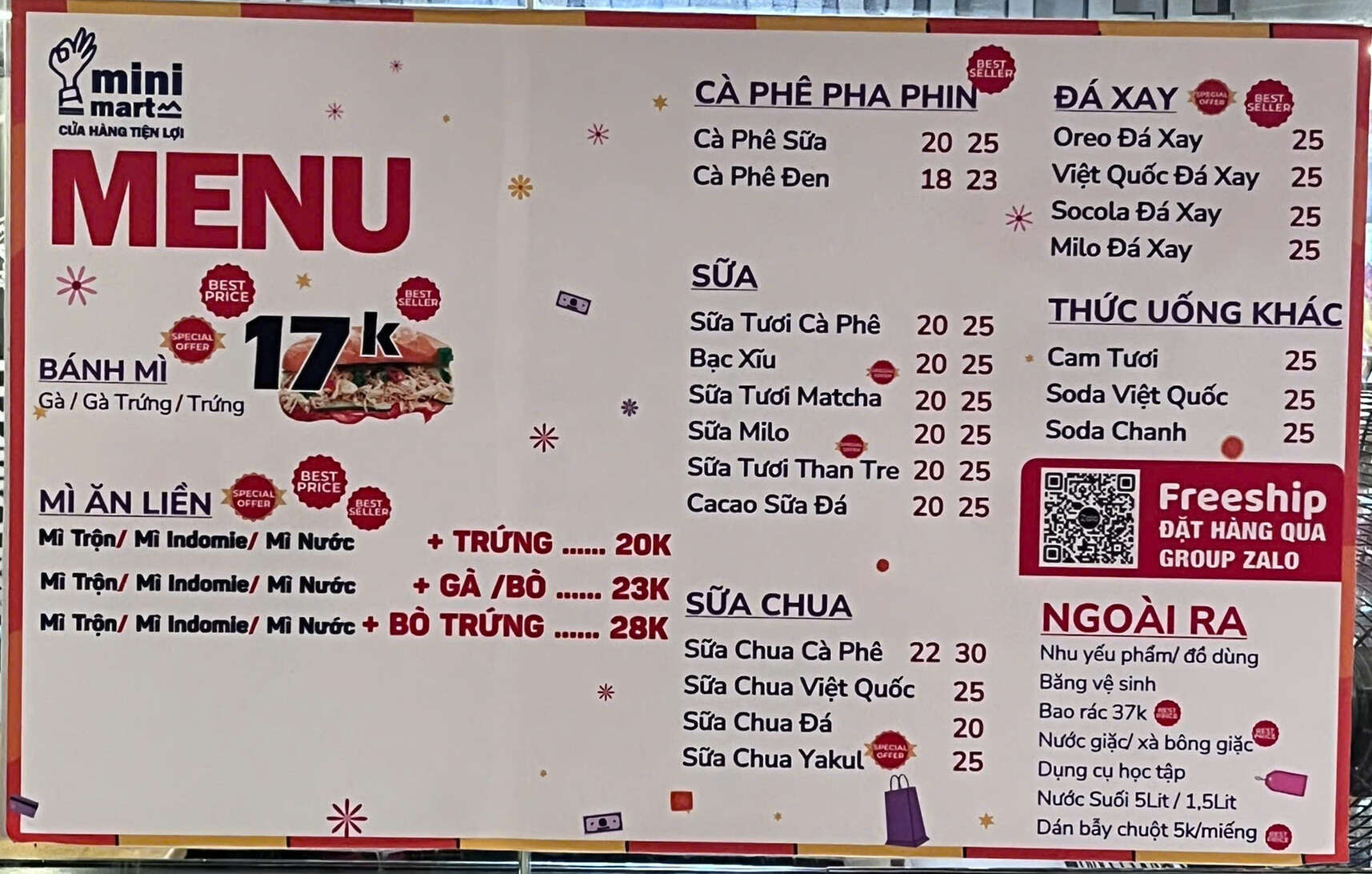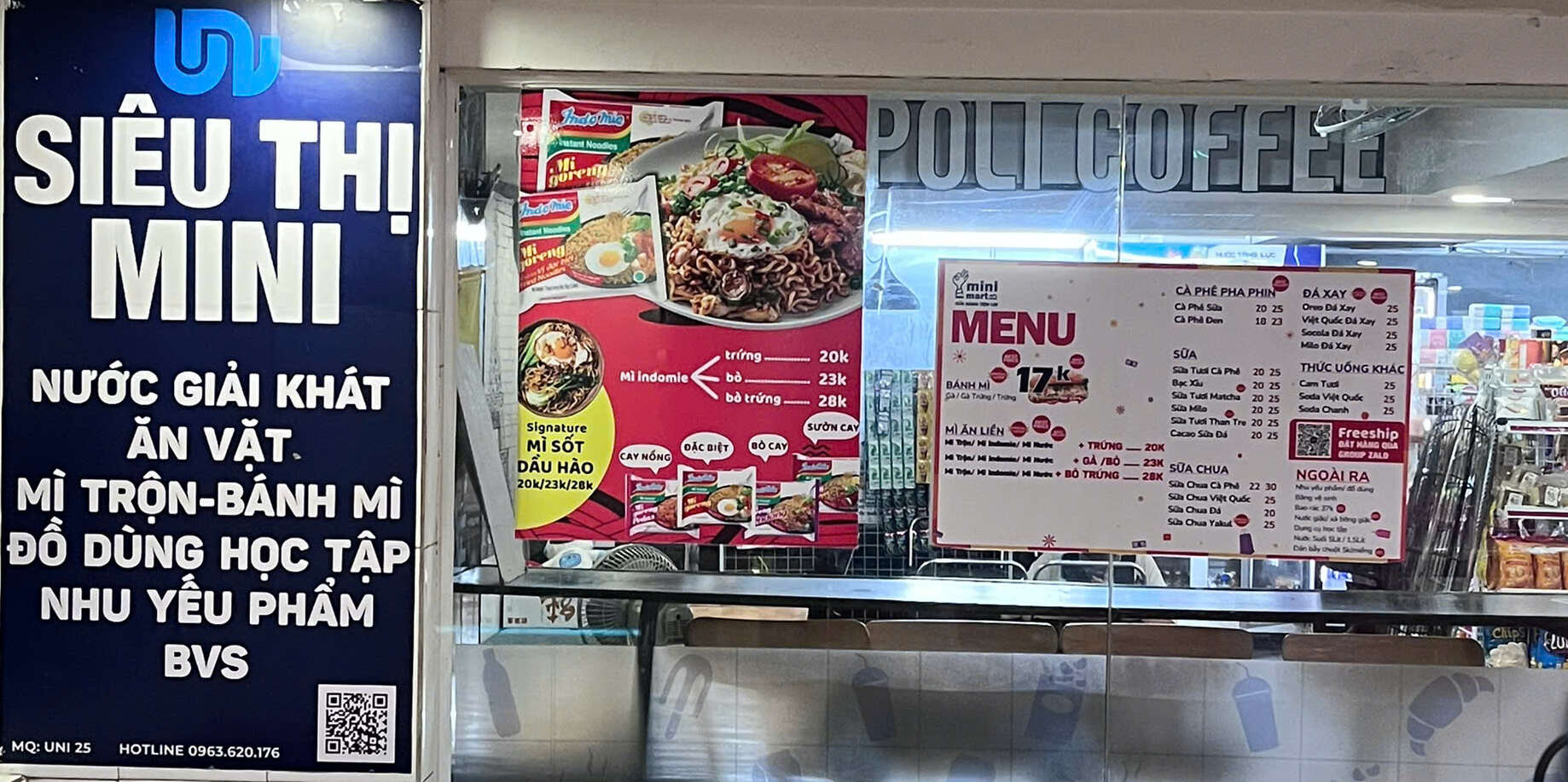 Tại đây, bạn có thể chọn bánh mì gà, gà trứng, trứng cho bữa ăn gọn nhẹ; mì ăn liền gà, bò, trứng cho giờ học vội; cùng các món uống như cà phê pha phin, sữa mix vị, sữa chua mix vị, đá xay mát lạnh. Ngoài ra, Minimart còn cung cấp nhu yếu phẩm và đồ dùng học tập thiết yếu, đáp ứng mọi nhu cầu sinh hoạt ngay trong khuôn viên trường.