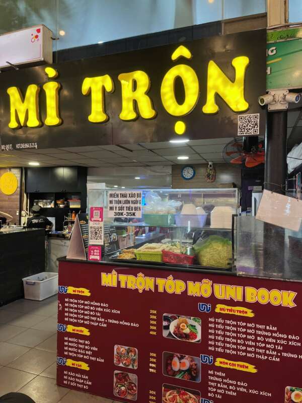 Không chỉ có mỳ trộn, quầy còn phục vụ mỳ nước thịt bò, mỳ xào hải sản, mỳ Ý sốt thịt bò – đáp ứng mọi khẩu vị, từ truyền thống đến Âu – Á.